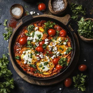 Dive into a sun-drenched culinary adventure with our vibrant Mediterranean Shakshuka with Feta and Herbs! This recipe transcends the ordinary shakshuka, elevating it to a flavorful masterpiece brimming with the tastes of the Mediterranean. Imagine tender eggs gently poached in a rich, aromatic tomato sauce, infused with the bright zest of lemon, the savory depth of Kalamata olives, and the creamy tang of crumbled feta. A sprinkle of fresh herbs adds the final flourish, transforming this dish into a symphony of Mediterranean sunshine on your plate. Whether you’re a seasoned shakshuka enthusiast or a curious newcomer, this recipe promises a delightful culinary experience that will transport you straight to the sun-kissed shores of the Mediterranean.